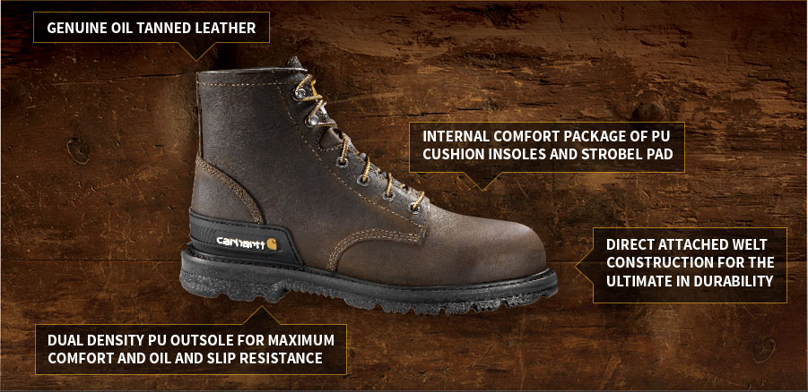 Dark Brown unlined oil tanned leather. Direct attached welt construction with dual density PU outsole. PU strobel pad with PU cushion insoles, molded TPU heel stabilizer. Oil chemical and slip resistant.